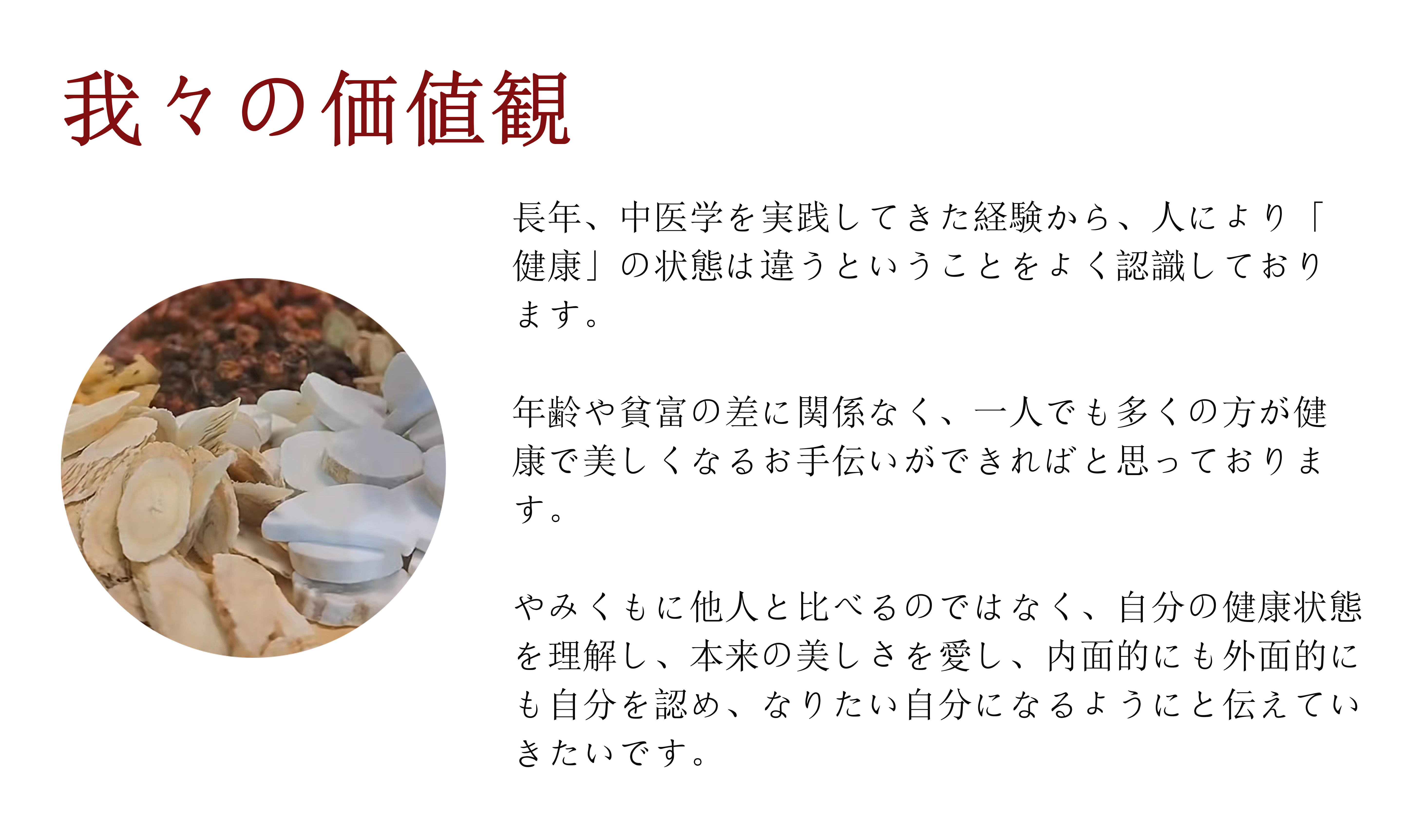 長年、中医学を実践してきた経験から、人により「健康」の状態は違うということをよく認識しております。